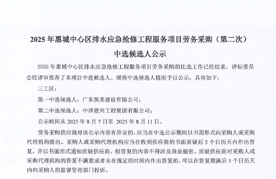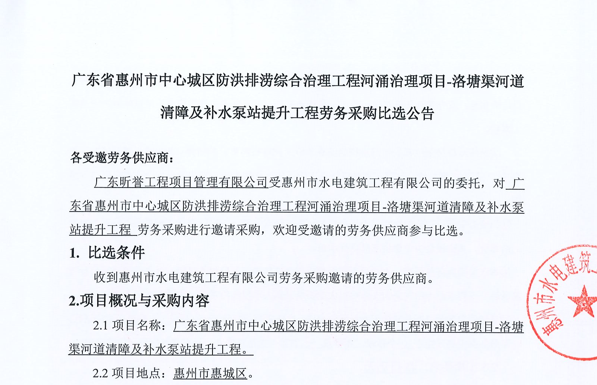 廣東省惠州市中心城區地下管網系統提升工程-內街小巷排水管網病害修復及錯混接改造項目一期施工勞務采購比選公告……